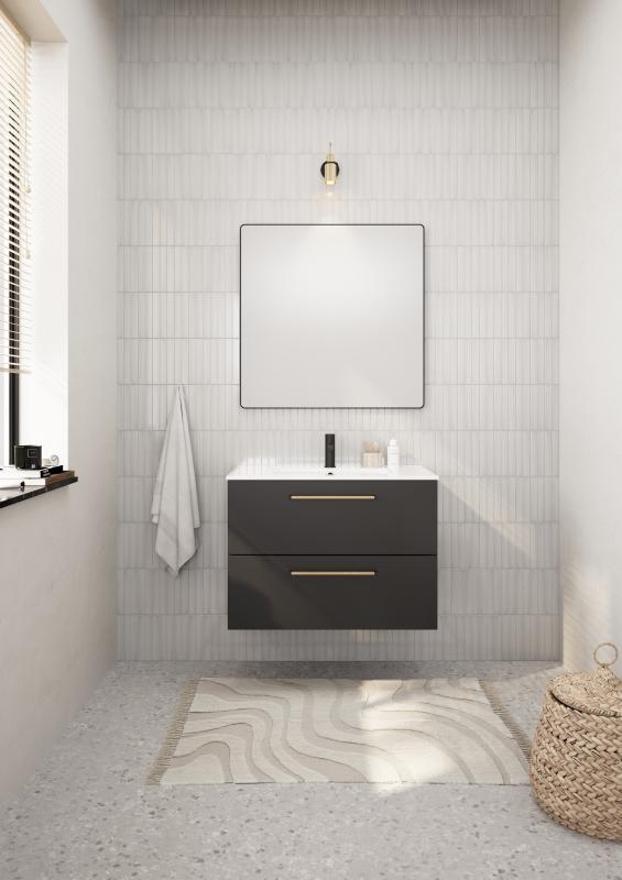INGRID Smal 80 cm i svart med FREYA Smal porselenservant og ØYRI speil med sort ramme. Grep i eik / svart.