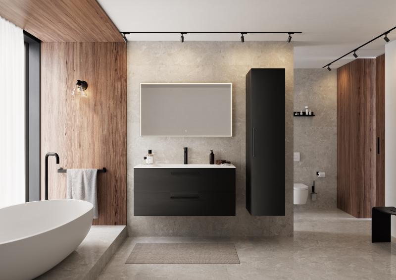 INGRID 120 cm i Svart Eik med VALE glsservant og VANGE speil med sort ramme. Høgskap 40 cm med hyller.