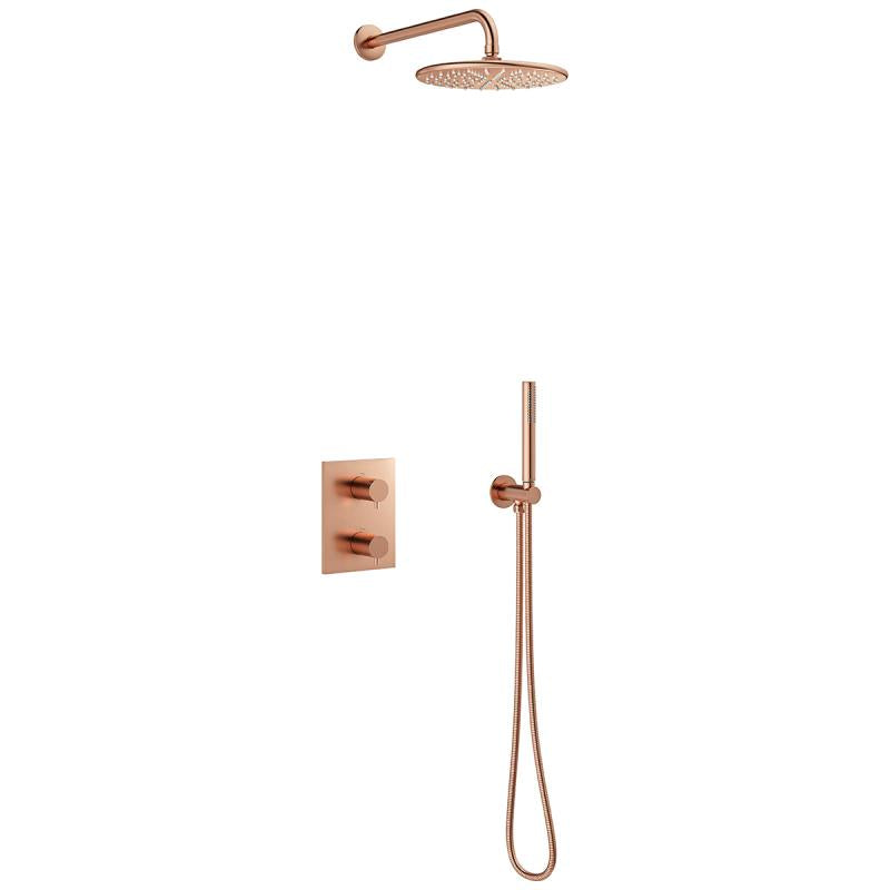 Komplett pakke inkludert dusjrør 400mm, dusjhode Ø250mm, håndusj, 1500mm metallslange med antitwist og veggbrakkett. Med lekkasjesikret boks og innvendig rørtilkobling. PVD overflate i børstet kobber.