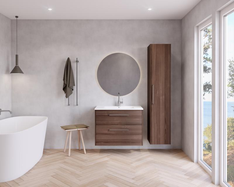 Baderomsmøbel med frontene ferdig montert. Pris inkludert alle moduler i miljøet; Servantskap med Bris porselensservant B81 D46,5. Moon speil med lys og varmefelt for antidugg ø80 cm. Høyskap med en hel dør B35 H170 D40. Totalbredde mijlø inkl. høyskap 110 cm.