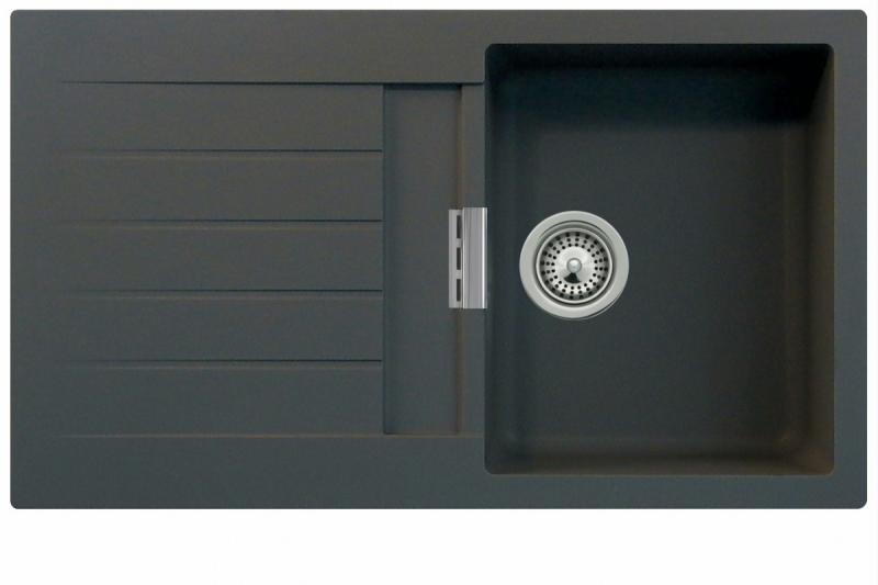 Kjøkkenvask med 1 enkel kum og varenningsfelt i materialet Granite Cristalite. For nedfelling og underliming. Inkludert kurvventil og vannlås