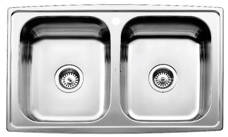 Kjøkkenvask for nedfelling, under- eller planliming, med 2 kummer uten rillefelt. Leveres med kurvventil og vannlås.