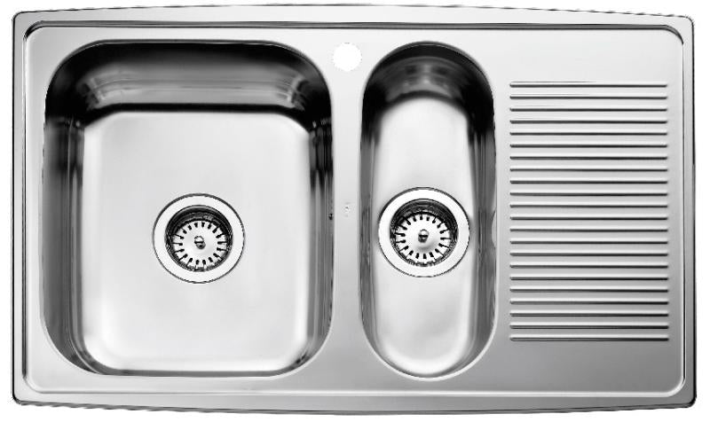 Kjøkkenvask med en stor og en liten kum samt avrenningsfelt for nedfelling, under- eller planliming. Leveres med kurvventiler, overløp i den store kummen og vannlås. Vendbar