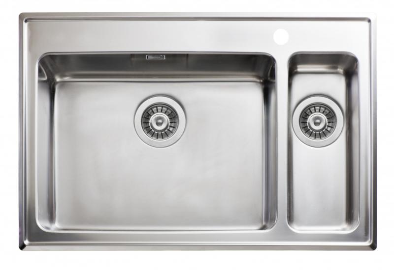 Omnia kjøkkenvask med en ekstra stor og en liten kum, med universalflens.