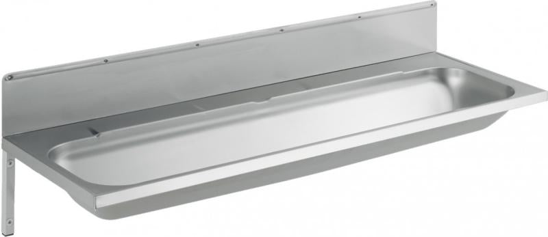 "Helpresset vaskerenne i rustfritt stål for veggmontering. Leveres med veggkonsoller og 1 1/2" avløpsventil med kuppelrist inkl bakplate. Avløp i midten"