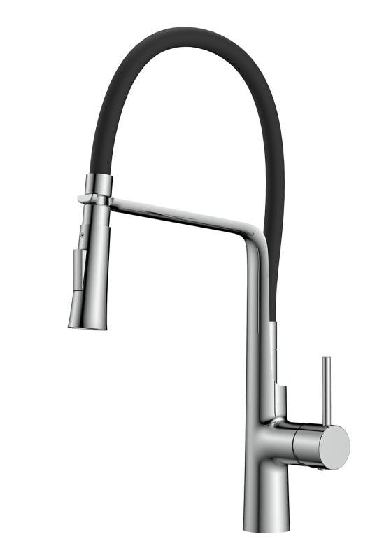 Praktisk kjøkkenbatteri i organiske former av messing i krom utførelse med avtagbart munnstykke. Svingradius på 110°. Testet og sertifisert av SINTEF.