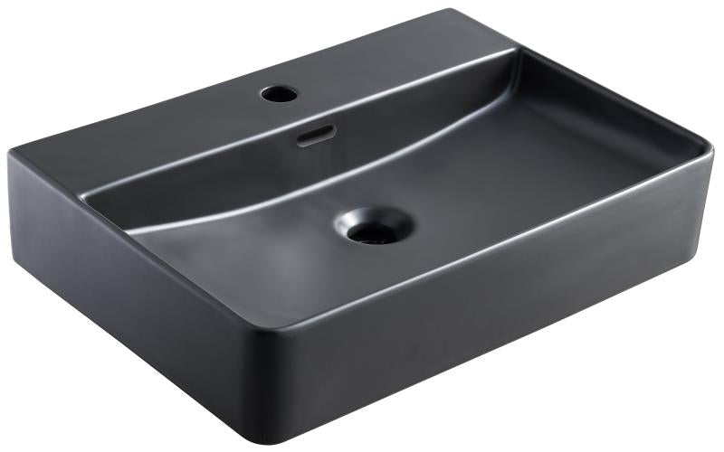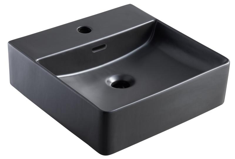 Kvadrat Sort - Porselen servant Elegante servanter med markante avrundede hjørner i tynn matt sort matt porselen. Modellen leveres i breddene 42 med hull for armatur eller uten hull for veggarmatur. Modellen leveres også i 60 bredde uten hull for veggarmatur eller armatur bak servant. *Bunnventil medfølger ikke