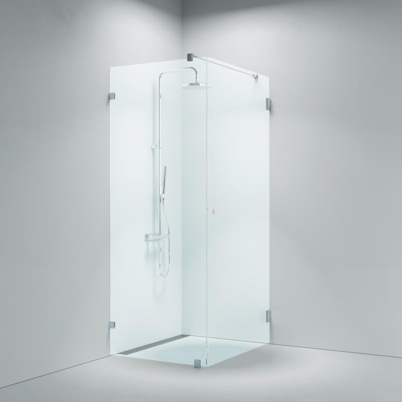 Eksklusiv hjørne dusjløsning med fastfelt + svingdør. 900 x 900mm. Krom hengsler og klart herdet 8 mm glas, med nano-behandling som standard. Produsert i Europa.