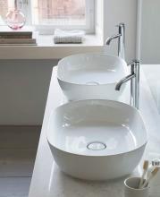 slipt underkant, uten overløp, uten plattform til kranhull, Inkl. bunnventil med keramisk skjuler, Inkl. fastgjørelse. Design by Cecilie Manz