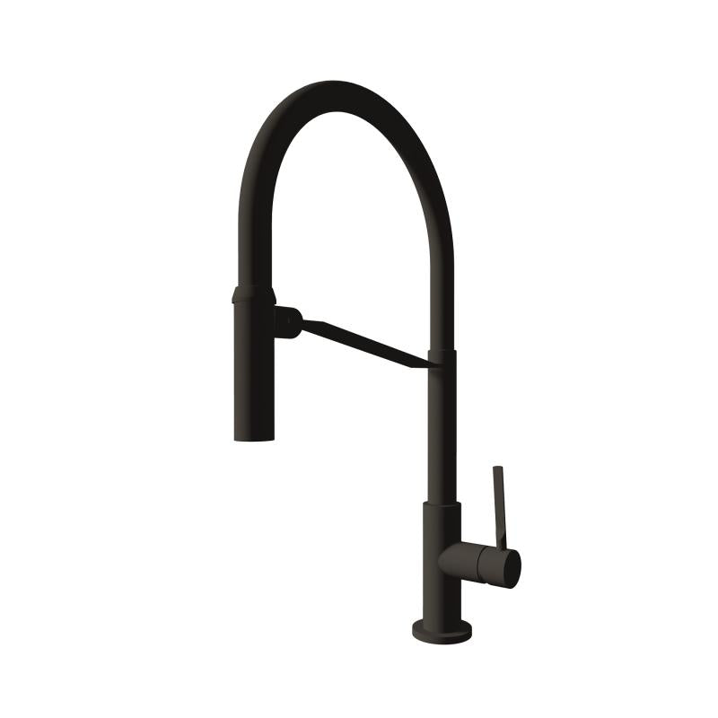 Høy og elegant kjøkkenkran med praktisk sort fleksibel slange som festes med magnet på staget. Sort matt overflate på kran. Høyde 450mm. Finnes også med krom overflate og sort slange.