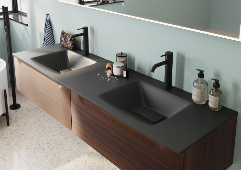 MARI 1 -skuffs vist i 160 cm i Valnøtt. VALE glasservant og VANGE speil m sort ramme.