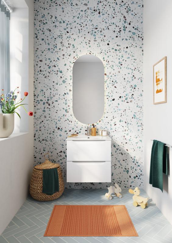 MARI Smal Kvit 60 cm med FREYA Smal servant i porselen. TISTEL ovalt speil med baklys.