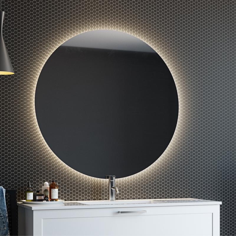 Moon speil med lys og varmefelt for antidugg ø100 cm. Stemingslys på faststrøm. Tilgjengelig i ø60, ø80,ø100 cm og ø120cm.
