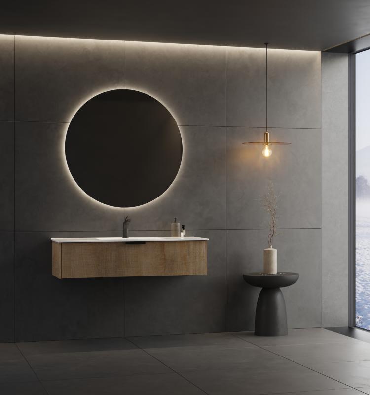 Pris inkludert alle moduler i miljøet; Servantskap med en myktlukkende skuff med glass i sidene og Aqua porselensservant B121 D46. Moon speil med varmefelt for antidugg ø100 cm. Totalbredde miljø: 121 cm.