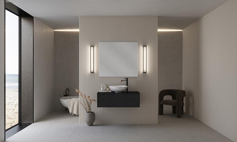 Servantskapet har en myktlukkende skuff med glass i sidene. Prisen inkluderer moduler i miljøet: New Block servantskap med benkeplate og Rondo mineralservant B91 D46,5, Speil med skjulte fester B90 H80.