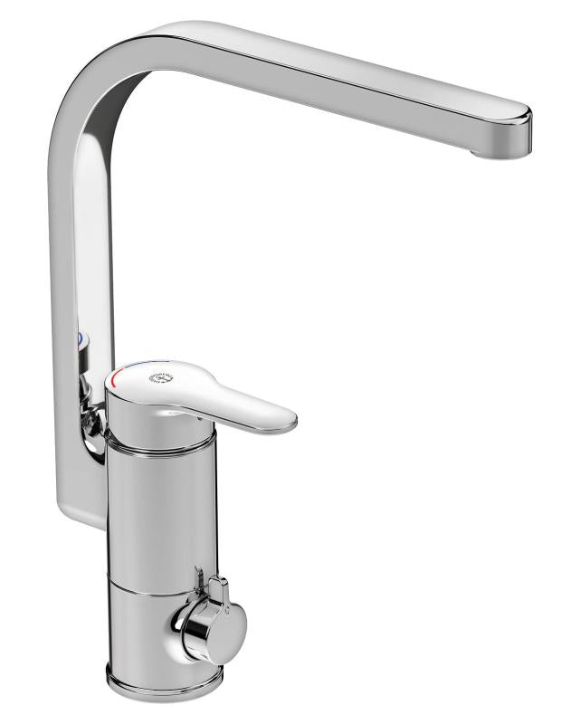 Gustavsberg Nordic³ kjøkkenkran med høy tut og avstengning for oppvaskmaskin. Spak med tydelig fargemerking for varmt og kaldt vann. Soft move, keramisk pakke med myk og presis drift. Tut kan dreies 110° ( inkludert sperre ved 60°).