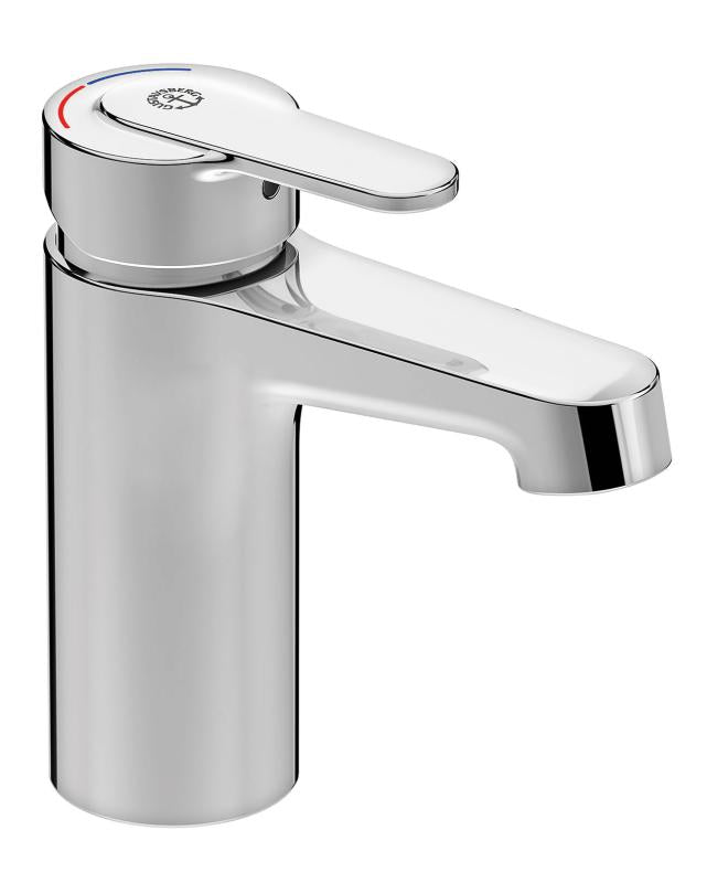 Gustavsberg Nordic Plus servantkran med skjult strålesamler for enkel rengjøring. Med sidedusj og veggholder. Spak med tydelig fargemarkering for varmt og kaldt vann.