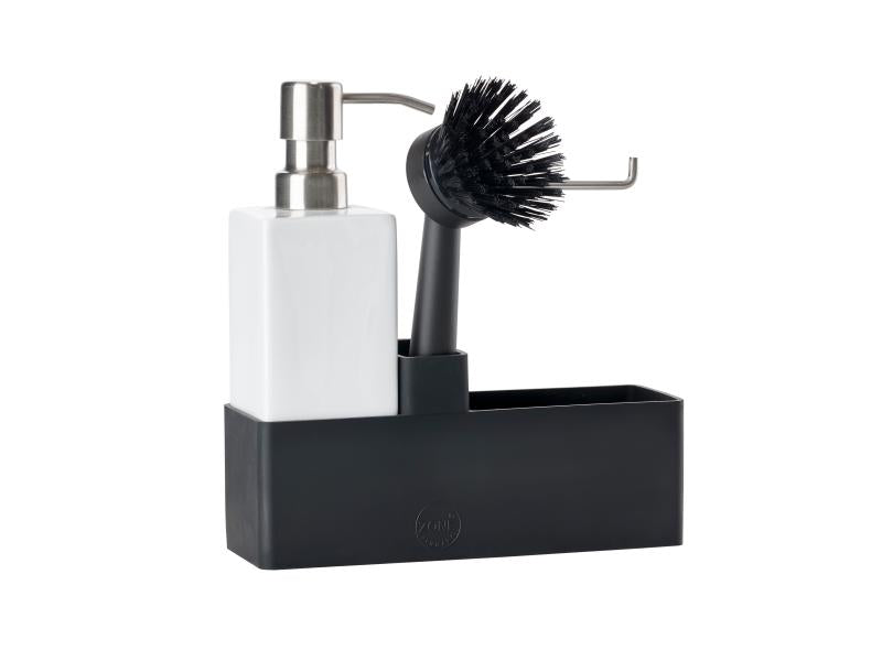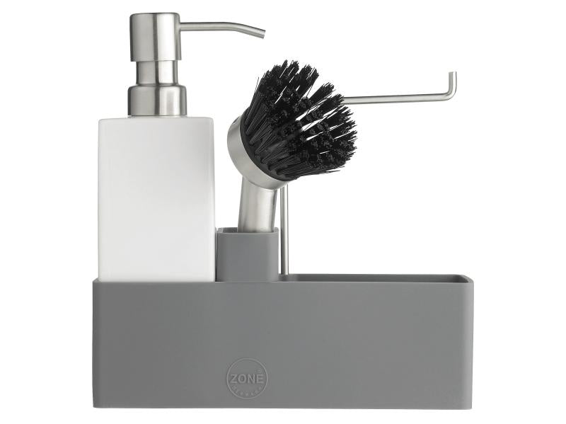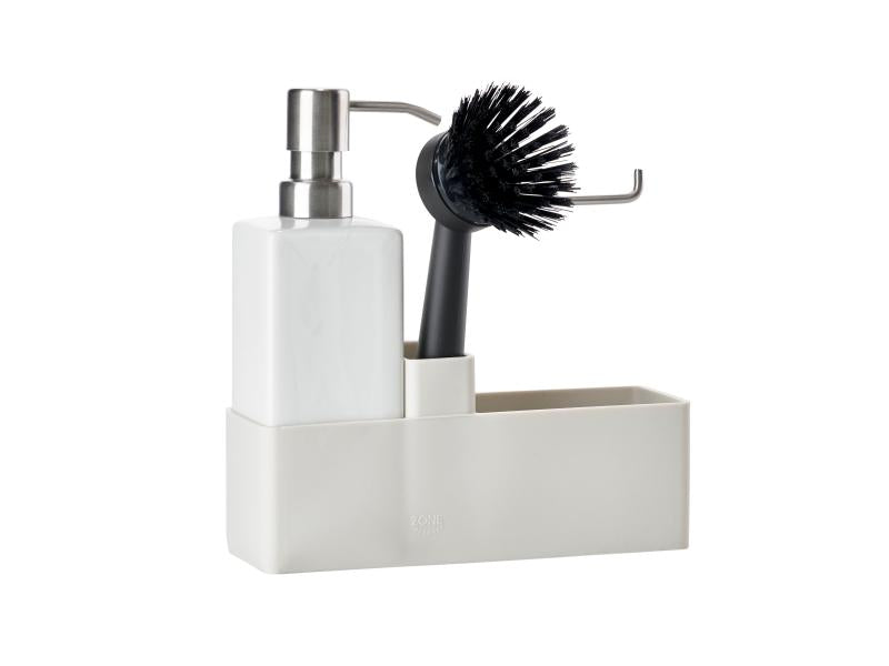 Zones populære alt-i-ett-oppvasksett. Såpedispenseren er laget i solid keramikk, og oppbevaringsdelen er av ripefri og rengjøringsvennlig silikon. Børsten kan stå på egen hånd, og børstehodet kan byttes ut, slik at du alltid har en ren børste.