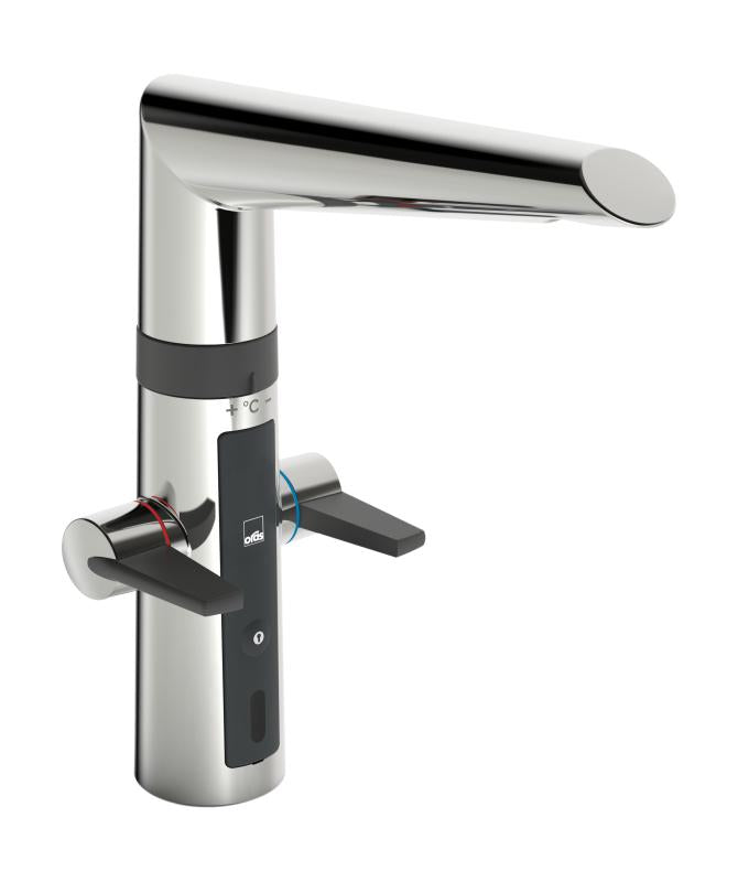 Hybrid kjøkkenkran med både grepsvennlige hendler for varmt- og kaldtvann og berøringsfri funksjon, samt høy tut.