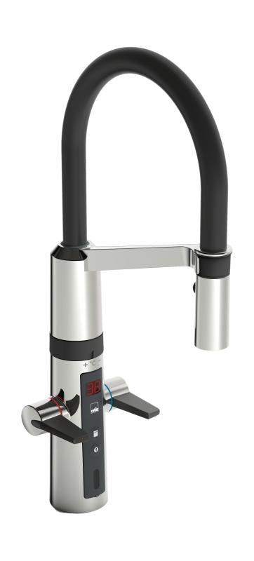 Hybrid kjøkkenkran med grepsvennlige hendler for varmt og kaldt vann samt berøringsfri funksjon. Utstyrt med digitalt temperaturdisplay og elektronisk avstengning til oppvaskmaskinen. Høy fleksibel tut med to sprayfunksjoner. Den berøringsfrie funksjonen aktiveres ved å føre hendene foran kranens sensor. Vanntemperaturen for berøringsfri håndvask justeres ved å vri på ringen mellom kranen og tuten. Den berøringsfrie funksjonen kan enkelt slås av/på. Ventilen for oppvaskmaskin åpnes ved å trykke på avstengningsknappen. Ventilen stenger automatisk etter 4 eller 12 timer (Åpen ventil i 4 timer ved ett trykk og 12 timer ved 5 sek vedvarende trykk). Elektrisk tilkobling er gjennom adapter 230/5 V (stikkontakt).