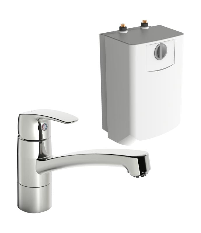 Kjøkkenkran med varmtvannsbeholder for fritidsbolig. Tutens svingradius er fabrikkinnstilt til 120° (kan begrenses til 40°-80°). Vannmengde 5 l / min. På grunn av ekspansjon som oppstår ved oppvarming av vann, kan det dryppe vann fra kranens strålesamler. Dette er naturlig og skal ikke forhindres. Det er viktig å være oppmerksom på at vannet som drypper er varmt og kan føre til skålding. Strålesamleren kan ikke byttes ut eller kompletteres med andre komponenter. Trykkløs varmtvannsbeholder 5 l, for stikkontakt. Enkel å montere. Bruksområde fra +35° til +85°C (anbefalt +60°C). For å forebygge frostskader må kranen og varmtvannsbeholderen tømmes. Denne varmtvannsbeholderen kan kun brukes sammen med Oras kraner for fritidsbolig. Kranen og varmtvannsbeholderen bør ikke installeres separat.