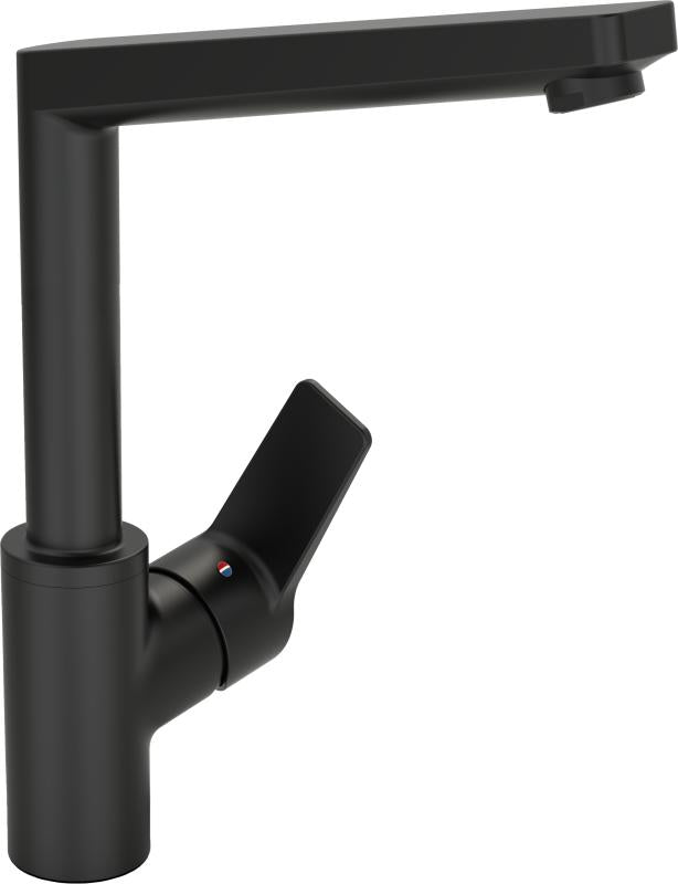 Kjøkkenkran i matt sort, med høy svingbar tut og sidegrep. Det er også innebygd alternative begrensninger for vanntemperatur og maksimal vannmengde.
