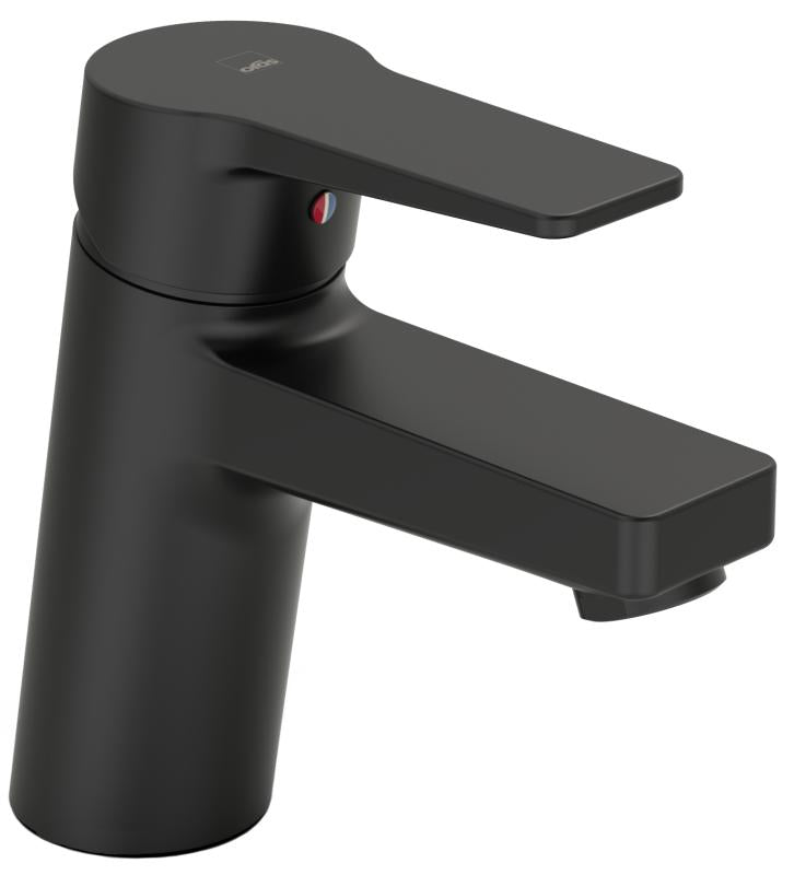 Servantkran i matt sort med fast tut. Det er også innebygd alternative begrensninger for vanntemperatur og maksimal vannmengde.
