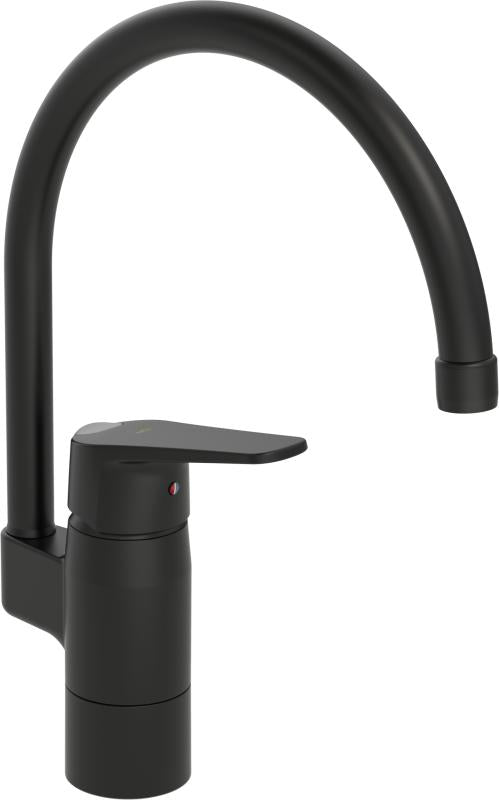 Kjøkkenkran i matt sort, med høy svingbar tut og strålesamler. Tutens svingradius er fabrikkinnstilt på 120° (kan begrenses til 40?80°). Justerbar sokkel som gjør at tuten monteres bak, til høyre eller venstre på krankroppen ved installasjon. Hendelen er utstyrt med en økoknapp som kan begrense vannmengden. Funksjonen oppheves enkelt ved trykke på knappen. Sikker i bruk og vannbesparende.