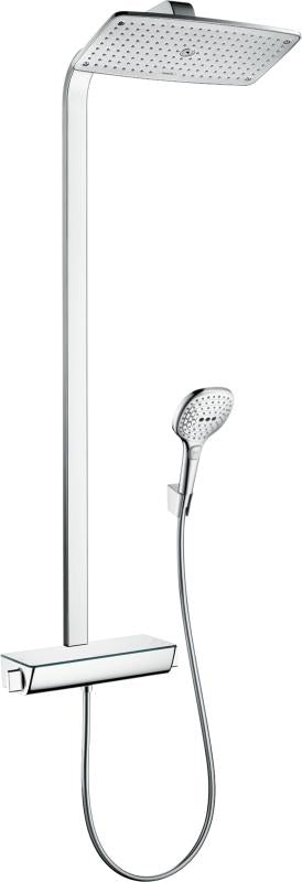 • består av: hodedusj, hånddusj, dusjtermostat, dusjslange, dusjholder • hodedusj Raindance E 360 Air • dusjhodestørrelse hodedusj: 360 x 190 mm • stråletype hodedusj: RainAir • kuleledd: hodedusjvinkel justerbar • hylle laget av sikkerhetsglass • overflate hylle: krom • maksimal gjennomstrømningsmengde ved 3 bar: 14,5 l/min • gjennomstrømningsmengde RainAir (ved 3 bar): 14,5 l/min • gjennomstrømningsmengde for hånddusj ved 3 bar: 13,5 l/min • min. driftstrykk: 1,5 bar • maks driftstrykk: 10 bar • dusjbendlengde hodedusj: 380 mm • termostat Ecostat Select • sikkerhetssperre ved 40°C • justerbar varmtvannsbegrensning • uttak styrt av dreiegrep • passer til gass gjennomstrømningsvarmer • monteringstype: utenpåliggende montering • tilslutningsdimensjon DN15 • tilslutningsgjenger G ½ • senteravstand 150 ± 12 mm • sikker mot tilbakestrømning • stangens lengde: 900 mm • kan eksisterende G ¾ tilkoblinger i veggen ikke fjernes, bruk adapter no. 02026000 • stigerør kan ikke forkortes • finnes også i kort versjon (850 mm rør). Kontakt Hansgrohe for mer informasjon. • kortere og lengre stigerør kan bestilles • 2 funksjoner