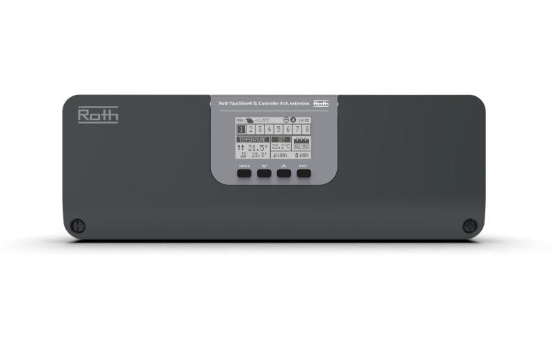 Ved behov for mer enn 8 soner, så tilkobler man en utvidelsesmodul som har ytterligere 8 soner, 8 termostater ogmaks 32 stk 230 V reguleringsmotorer. Medfølgende DIN skinne