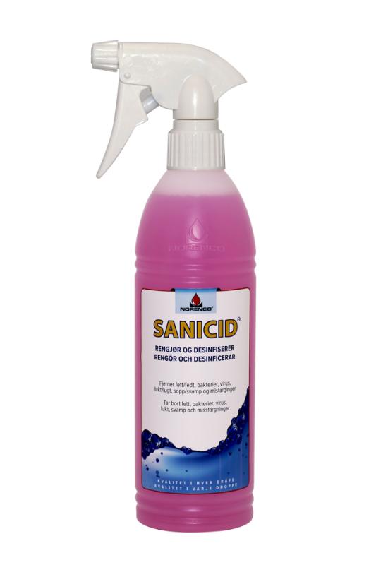 Sanicid egner seg utmerket til rengjøring og desinfisering av dusj, toalett, badekar, vegg og gulvfliser i våtrom, og andre steder man skulle behøve god rengjøring. Rengjør, desinfiserer og fjerner lukt. Sanicid fjerner hudfett, bakterier, flekker, smuss, fotsopp, vortevirus og microorganismer. 600 ml.