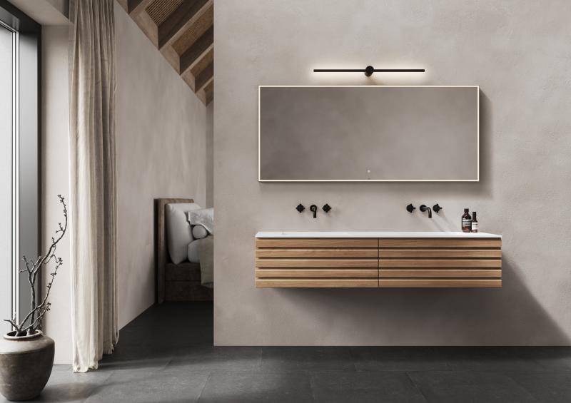SELMA Eik 160 med Corian plate og 2 servanter EIR. FRAMFJORD speil i 160 cm bredde.