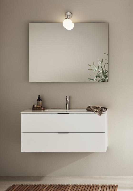 "Hafa Go servantskap med porselensservant er praktiske og stilrene baderomsmøbler med glatte fronter og mulighet for deg å sette din stil ved å legge til et av våre håndtak. To myktlukkende skuffer med fullt uttrekk gir god oversikt over innholdet.