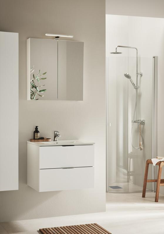 "Hafa Go servantskap med porselensservant er praktiske og stilrene baderomsmøbler med glatte fronter og mulighet for deg å sette din stil ved å legge til et av våre håndtak. To myktlukkende skuffer med fullt uttrekk gir god oversikt over innholdet.