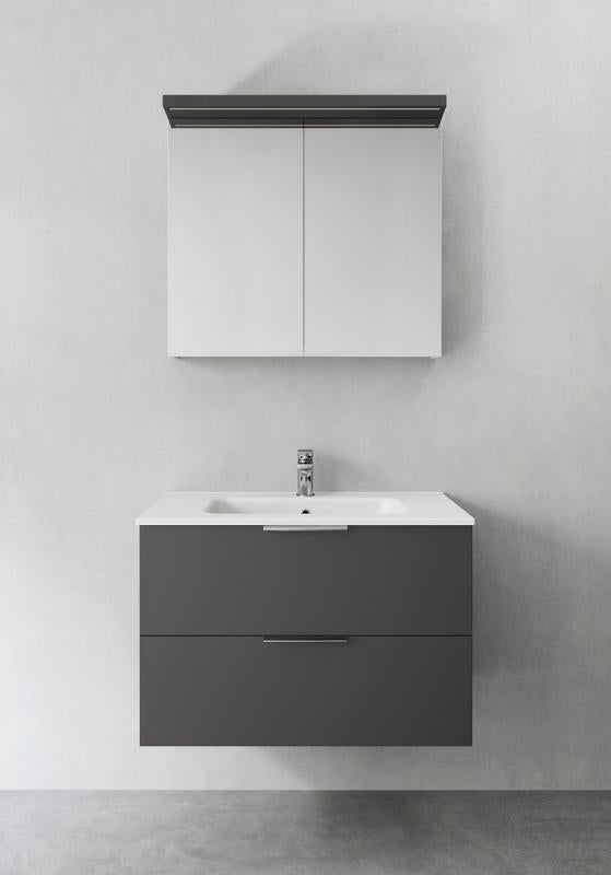 Servantskap Hafa Shape med håndvask On Verge og Store speilskap. Myktlukkende skuffer med fullt uttrekk, skuffesider av metall og en innredning av bambus for småsakene. Dessuten en uttakbar skuffematte som holder tingene på plass. Øverste skuffen har U-konstruksjon som gir plass til vannlås. Kompletter med PUM-vannlås til kommode. Forberedt for både vegg- og gulvavløp. Justerbare monteringsbraketter. Skuffebelysning, strømuttak og håndtak kan kjøpes som tilbehør.