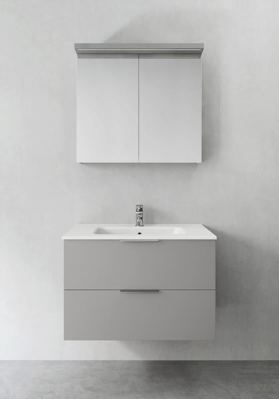 Servantskap Hafa Shape med håndvask On Verge og Store speilskap. Myktlukkende skuffer med fullt uttrekk, skuffesider av metall og en innredning av bambus for småsakene. Dessuten en uttakbar skuffematte som holder tingene på plass. Øverste skuffen har U-konstruksjon som gir plass til vannlås. Kompletter med PUM-vannlås til kommode. Forberedt for både vegg- og gulvavløp. Justerbare monteringsbraketter. Skuffebelysning, strømuttak og håndtak kan kjøpes som tilbehør.
