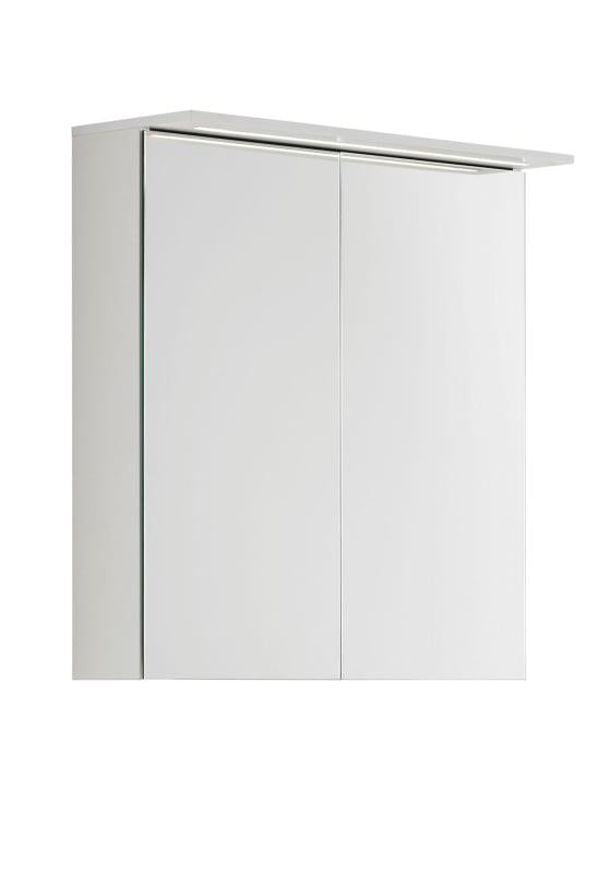 "Lettplassert speilskap med ekstra kraftig belysning. Dobbelsidige speildører og to flyttbare hylleplan i glass. Strømuttak formontert til venstre i skapet. Kan flyttes og plasseres til høyre. LED-belysning som lyser oppover og nedover med en lysmengde på 1116 lm. Lystemperatur 3000K.