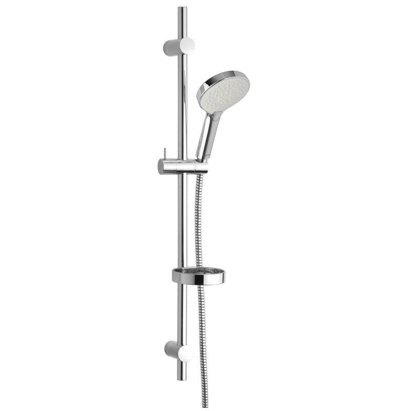Dusjgarnityr med fleksibelt veggfeste, maks avstand 740mm. Tre innstillinger på stråle. Sparedyse i hånddusj som enkelt kan fjernes.Gir 9l vann pr minutt.