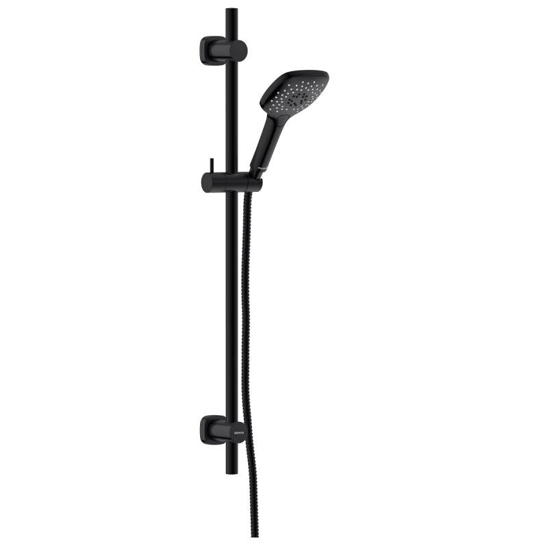 Dusjgarnityr med fleksibelt veggfeste, maks avstand 740mm. Tre innstillinger på stråle. Sparedyse i hånddusj som enkelt kan fjernes.Gir 9l vann pr minutt. Sort matt.