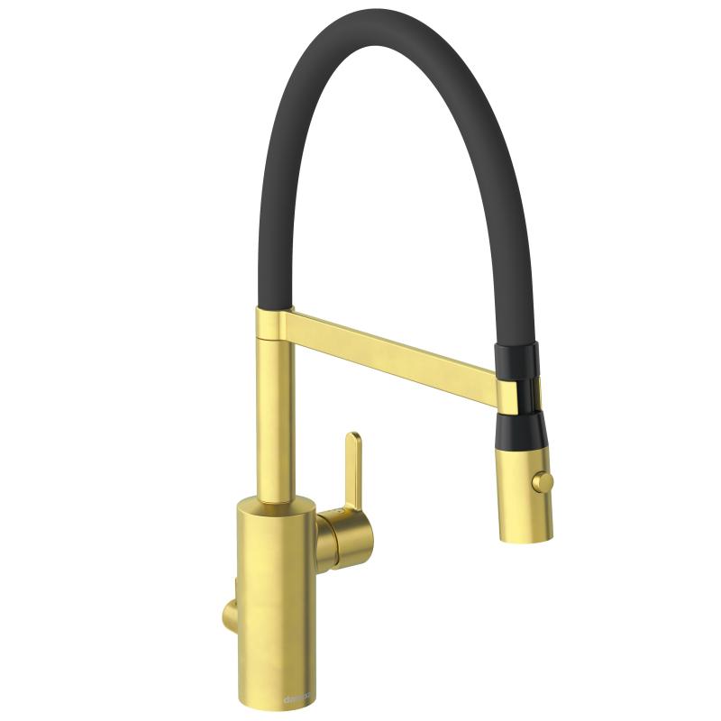 Kjøkkenkran med fleksibel sort slange og avstengning for oppvaskmaskin. 120 grader svingbegrensning.Velg mellom vanlig stråle og dusjstråle. 8 liter vann pr min. Kaldstart.Børstet messing (PVD)