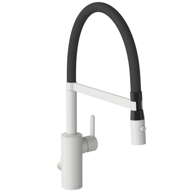 Kjøkkenkran med fleksibel sort slange og avstengning for oppvaskmaskin. 120 grader svingbegrensning.Velg mellom vanlig stråle og dusjstråle. 8 liter vann pr min. Kaldstart. Hvit matt.