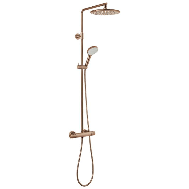 Komplett takdusj med 250mm takdusjhode. Hånddusj med 110mm dusjhode og rubcelan. Justerbar stang 1020-1250mm. Vender mellom kaldt og varmt vann i termostatkranen. Skoldesperre. Ekstra holdbar PVD behandlet overflate.