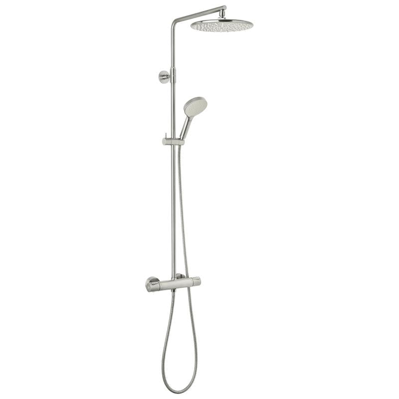Komplett takdusj med 250mm takdusjhode. Hånddusj med 110mm dusjhode og rubcelan. Justerbar stang 1020-1250mm. Vender mellom kaldt og varmt vann i termostatkranen. Skoldesperre.