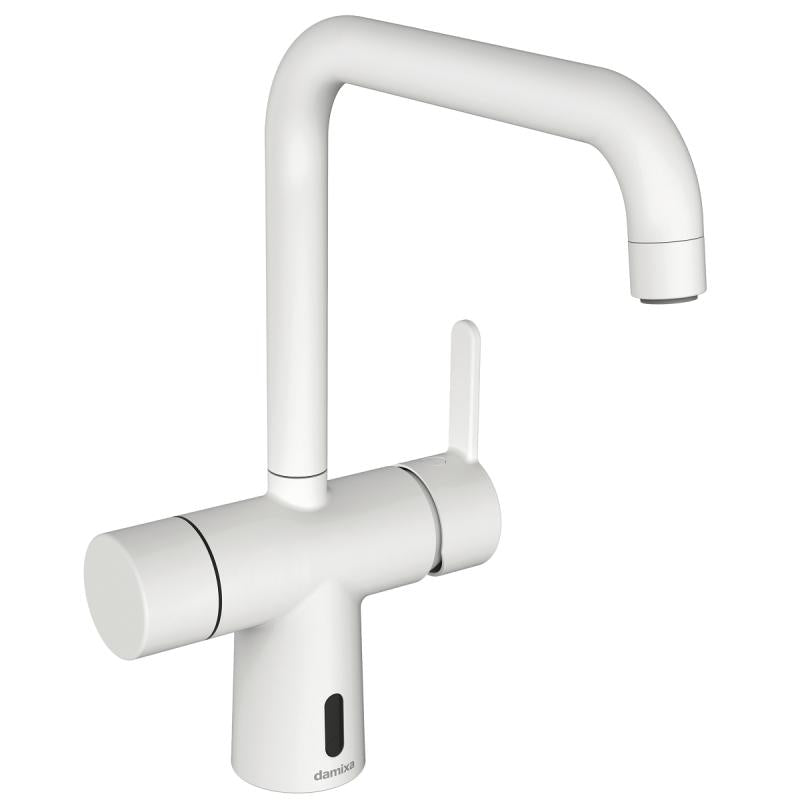 Sensorstyr kjøkkenkran kombinert med muligheter for manuell bruk av hendel. Enkel justering av styrke og temperatur på vann. Hvitt matt overflate.