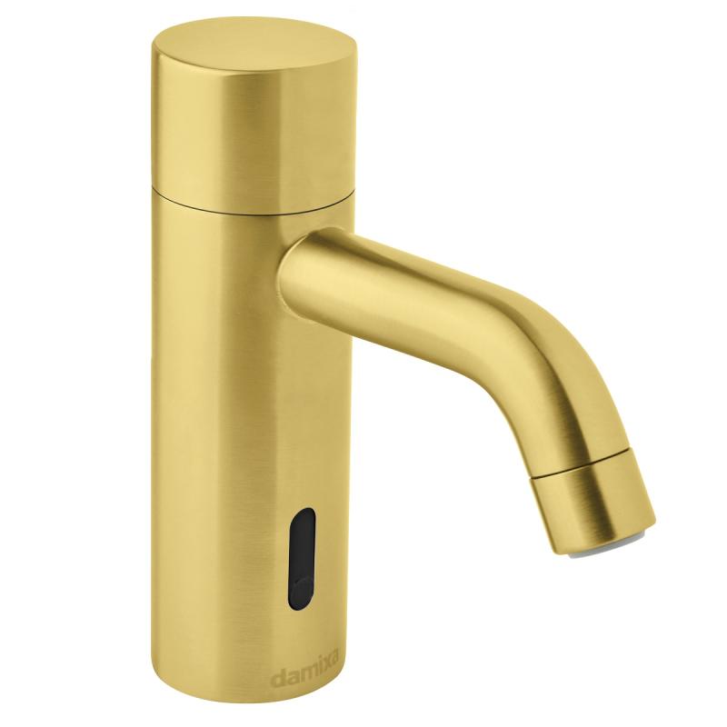 Beregnet for offentlig miljø. Sensorstyrt servantkran med fast innstilling av temperatur og vannmengde. Børstet messing, PVD overflate.