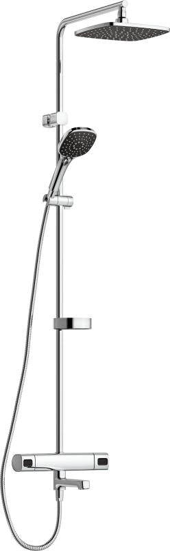 Sikkerhetsbatteri for badekar Trykk- og termostatstyrt EcoSafe® blander Med reversibel overdel Svingbar utløpstut som vender kar/dusj Med tilbakeslagsventiler etter standard EN 1717 Sperreknapp v/38°C Sperreknapp mengde Eco Tak- og 3-strålig hånddusj med kalkavvisende sil Eco Flow, hånddusj 9 l/min og takdusj 12 l/min Slange, dusjstang (kan kappes ved behov) Med såpeskål