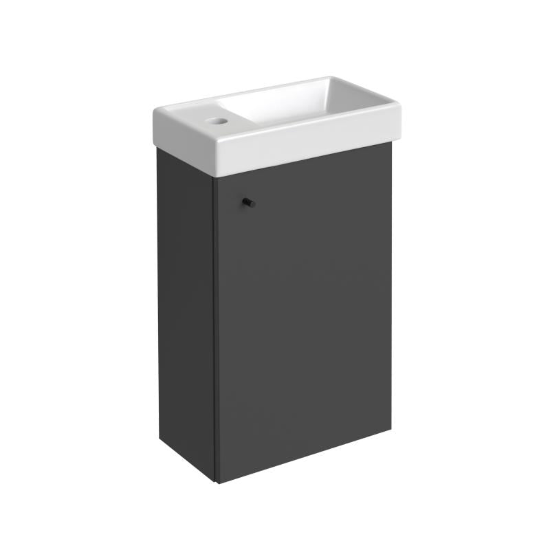 Small møbelpakke i mørk grå matt. Pakken inneholder underskap med en dør og vendbar porselensservant med overløp. Dør er ikke gjennomboret, slik at du kan velge grep selv. En elegant sort knott følger med. Mål servantskap: 38x21x61cm, servant: 40,5x22,5x8cm. Høyde totalt: 69cm.