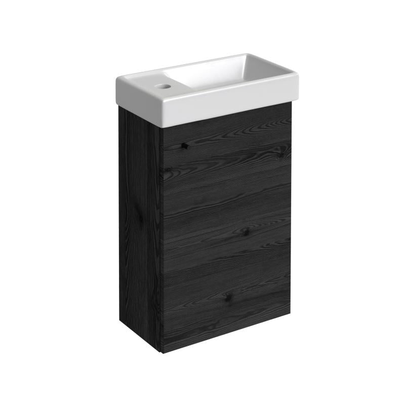 Small møbelpakke i sort eik. Pakken inneholder underskap med en dør og vendbar porselensservant med overløp. Dør er ikke gjennomboret, slik at du kan velge grep selv. En elegant sort knott følger med. Mål servantskap: 38x21x61cm, servant: 40,5x22,5x8cm. Høyde totalt: 69cm.