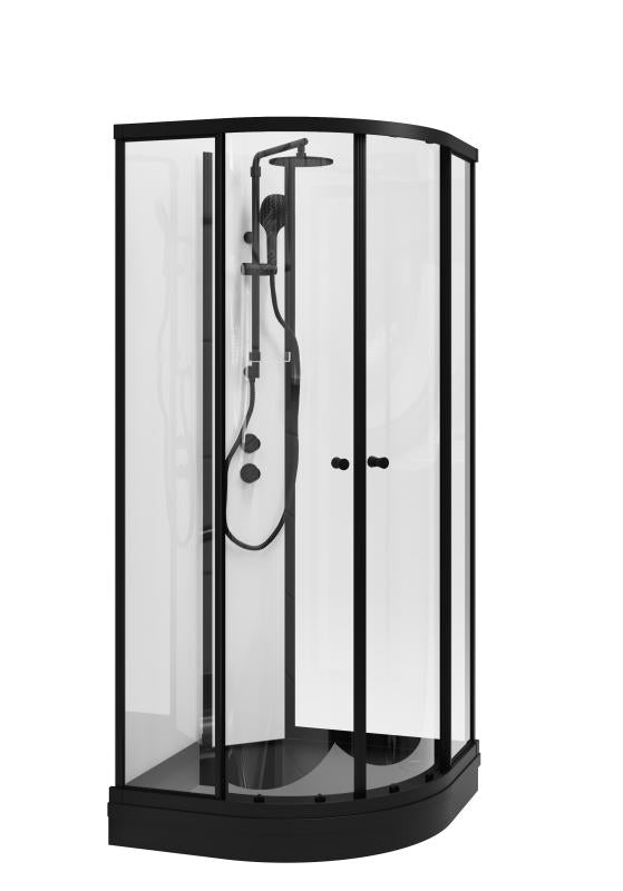 SOFIA Pluss med sort profiler, hvit søyle og klare bakglass. Et stilrent og minimalistisk dusjkabinett med toppdusj Stilrent dusjkabinett med rette, enkle linjer og vippbare dører som gjør det svært enkelt å rengjøre. Dører med doble trinser oppe og nede for jevn og stabil gange ved åpning og lukking. Leveres med integrert termostatbatteri og dusjsett med praktisk hylle. Lavt innsteg Med toppdusj og hånddusj Vippbare dører for enklere rengjøring Håndusj med regulerbar hånddusj-holder