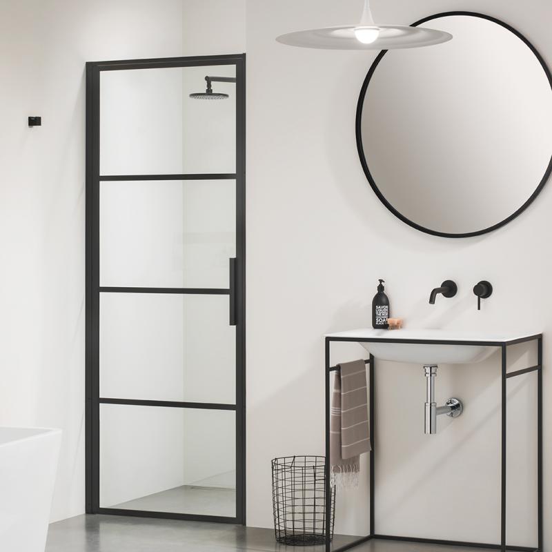Venstrehengslet 210 cm høy slagdør for montering i nisje. Serien har 8 mm sikkerhetsglass med Sealglas anti-kalk belegg. Døren åpnes kun utover. Døren kan også monteres med sidevegg, denne må da bestilles i tillegg. Utvendig monterte profiler og skruer sørger for at det er enkelt å rengjøre døren på innsiden. Farge: matt sort.
